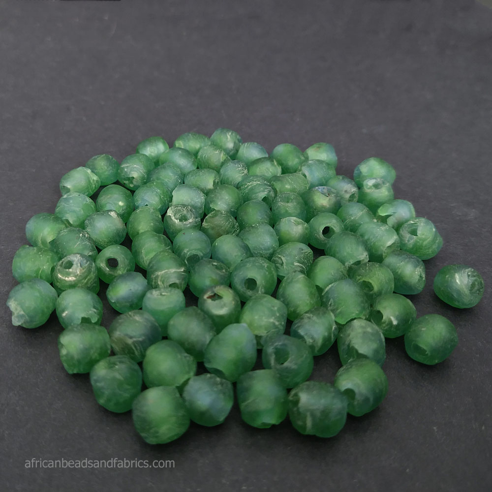 mottled green and palest blue African beads handmade in the ethnic Krobo in Ghana, suitable for jewelry and other crafts.